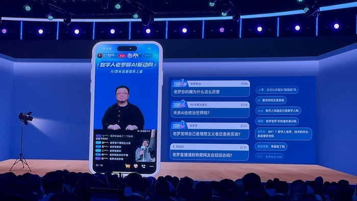 大会现场,主持人在介绍“会播星”产品时,拨通了数字人“老罗”的电话。罗永浩的数字人形象旋即出现在大屏幕上,并与主持人进行了实时的、幽默风格的互动。